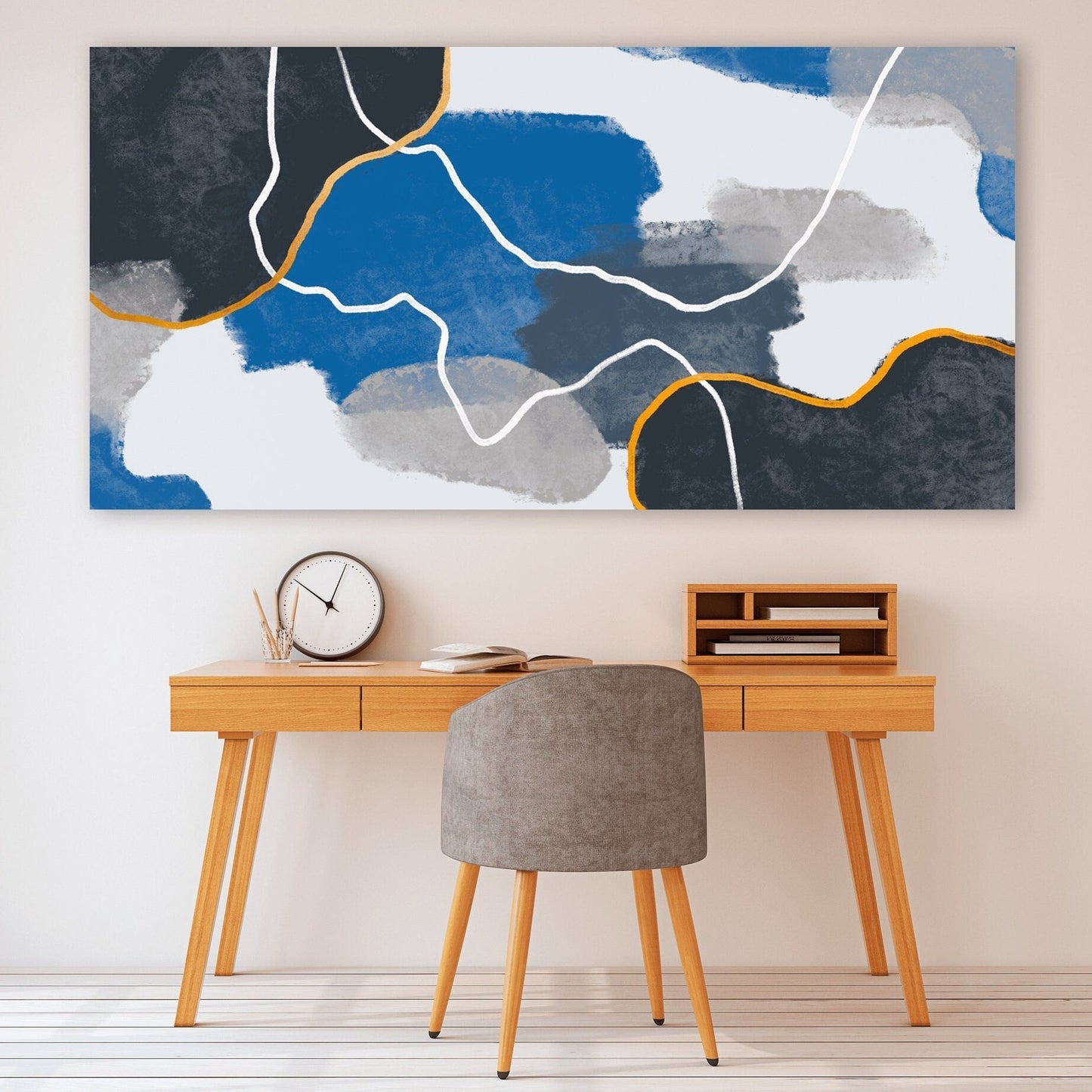 Extragroße abstrakte, moderne Wandkunst auf Leinwand in Blau, Schwarz und Weiß ist ein aktueller Trend in der Wanddekoration für Wohnzimmer, Schlafzimmer und Flur. Abstrakte Leinwanddrucke verleihen dem Raum einen besonderen und ungewöhnlichen Look und bringen visuelle Dynamik und moderne Akzente.